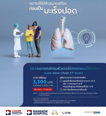 เนื่องในวันงดสูบบุหรี่โลก อย่ารอให้มีสัญญาณเตือนก่อนเป็น มะเร็งปอด โรงพยาบาลมะเร็งกรุงเทพ วัฒโนสถ ขอเชิญชวนผู้ที่มีปัจจัยเสี่ยงต่อการเกิดมะเร็งปอด สำหรับผู้ที่มีอายุ 50-80 ปี และมีปัจจัยเสี่ยง สูบบุหรี่วันละครึ่งซองมานานกว่า 30 ปี หรือ 1 ซองนานกว่า 20 ปี ปัจจุบันยังสูบอยู่หรือเลิกสูบบุหรี่ไม่ถึง 15 ปี และมีประวัติคนในครอบครัวเป็นมะเร็ง เข้ารับการตรวจเช็กปอดด้วย การตรวจเอกซเรย์คอมพิวเตอร์ช่องอกแบบใช้รังสีต่ำ (Low – dose Chest CT Scan) บริเวณทรวงอกด้วยปริมาณรังสีต่ำ สามารถตรวจพบจุดเล็กๆ หรือสิ่งผิดปกติในปอดได้ ทำให้ตรวจพบมะเร็งในระยะแรกได้ ตรวจง่าย ใช้เวลาไม่นาน ในราคา 3,300 บาท (ราคานี้ไม่รวมค่าแพทย์และสงวนสิทธิ์เฉพาะคนไทยและชาวต่างชาติที่อาศัยในเมืองไทย) ตั้งแต่วันนี้ – 31 สิงหาคม 2565