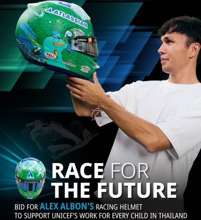 อเล็กซ์ อัลบอน อังศุสิงห์ นักแข่งรถฟอร์มูล่าวันชาวไทยเพียงหนึ่งเดียวในปัจจุบัน มอบหมวกกันน็อกที่ออกแบบขึ้นเป็นพิเศษสำหรับการแข่งขันสิงคโปร์กรังด์ปรีซ์ 2025 เพื่อนำออกประมูลการกุศล สนับสนุนงานของยูนิเซฟ ประเทศไทย โดยรายได้ทั้งหมดจะนำไปช่วยพัฒนาคุณภาพชีวิตของเด็กที่ขาดโอกาสทั่วประเทศ