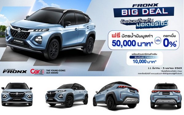 โดยซูซูกิ มีจัดแคมเปญพิเศษ “Big Deal” เพื่อต้อนรับงาน Motor Show 2026 สำหรับผู้ที่สนใจเป็นเจ้าของ All New SUZUKI FRONX ที่จองตั้งแต่วันนี้ถึงวันที่ 5 เมษายน 2569 และรับรถภายในวันที่ 10 เมษายน 2569 รับข้อเสนอพิเศษ ดังนี้