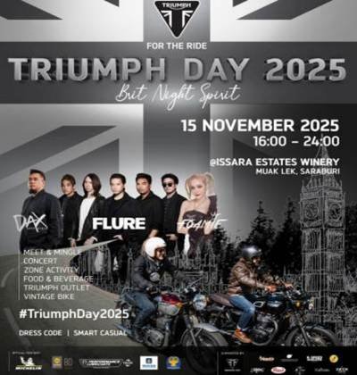 ล่าสุดไทรอัมพ์ได้เตรียมจัดงาน Triumph Day 2025 : Brit Night Spirit บิ๊กอีเวนต์แห่งปีที่เหล่าสุภาพบุรุษและสุภาพสตรีผู้หลงใหลในสไตล์อังกฤษ และความคลาสสิกของไทรอัมพ์รอคอย โดยผู้ร่วมงานจะสัมผัสประสบการณ์สุดพิเศษผ่านกิจกรรมมากมายทั้งการพบปะแลกเปลี่ยนประสบการณ์กับผู้ขับขี่ไทรอัมพ์จากทั่วประเทศ ดื่มด่ำไปกับความบันเทิงและเสียงดนตรีจาก Dax Rock Rider, Flure และ DJ Foamie ช้อปปิ้งสินค้าจากไทรอัมพ์และแบรนด์พันธมิตร ทั้งยังสนุกสนานไปกับเกมและจุดถ่ายภาพพร้อมรับของที่ระลึกให้เก็บเป็นความทรงจำ พร้อมเพลิดเพลินไปกับนิทรรศการรถจักรยานยนต์ไทรอัมพ์หลากหลายรุ่น ตลอดจนอร่อยไปกับอาหารและเครื่องดื่มจากร้านที่คัดสรรมาให้แบบเต็มอิ่มตั้งแต่ช่วงเย็นถึงเที่ยงคืนท่ามกลางบรรยากาศอันงดงามของไร่องุ่น