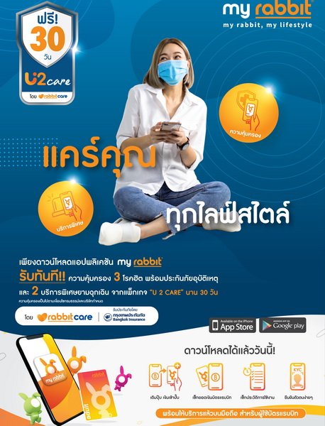 แอปพลิเคชัน My Rabbit และกดรับสิทธิ์ในแอปพลิเคชันจะได้รับความคุ้มครองประกันภัยฟรี นาน 30 วัน ได้แก่ ความคุ้มครองการเจ็บป่วย 3 โรคฮิตและผลประโยชน์เงินชดเชยปลอบขวัญและเงินชดเชยรายวันกรณีเป็นผู้ป่วยใน รวมถึงการประกันภัยอุบัติเหตุซึ่งคุ้มครองการเสียชีวิต การสูญเสียอวัยวะ สายตาหรือทุพพลภาพถาวรสิ้นเชิง การบริการให้คำปรึกษาแพทย์ทางไกลผ่านวิดีโอคอล (Tele Medicine) และบริการเรียกรถฉุกเฉิน”