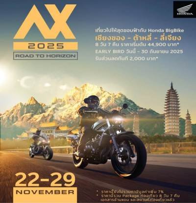 ฮอนด้าบิ๊กไบค์ ชวนสาวกบิ๊กไบค์ทุกค่ายเข้าร่วมกิจกรรม Asian Xperience 2025 Road To Horizon บิดฝ่าขอบฟ้าสู่แดนมังกร เปิดประสบการณ์การขับขี่สุดพิเศษตลอด 8 วัน 7 คืน ระหว่างวันที่ 22–29 พฤศจิกายน 2568 จากเชียงของ ต้าหลี่ สู่ลี่เจียง โดยผู้ร่วมทริปจะได้ขับขี่ผ่านเส้นทางธรรมชาติอันงดงาม ดื่มด่ำบรรยากาศเมืองระดับตำนานอย่างต้าหลี่ และสัมผัสมนต์เสน่ห์ของเมืองมรดกโลกยูเนสโกอย่างลี่เจียง พร้อมโปรโมชันพิเศษเปิดรับทุกค่าย! สำหรับผู้ที่จองภายในวันที่ 30 กันยายน 2568 จะได้รับสิทธิ์ส่วนลดทันที 2,000 บาท จากราคาเต็ม โดยแพ็กเกจเริ่มต้นเพียง 44,900 บาท (สิทธิ์มีจำนวนจำกัด)