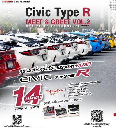 บริษัท ฮอนด้า ออโตโมบิล (ประเทศไทย) จำกัด จัดงานรวมตัวครั้งยิ่งใหญ่ของชาวแฟน ๆ สายสปอร์ตคนรัก Honda Civic Type R ในกิจกรรม Honda Civic Type R Fan Meet #2: The Unrivaled Performance ในวันเสาร์ที่ 14 มีนาคม 2569 ณ ศูนย์ฝึกขับขี่ปลอดภัยฮอนด้า ถนนรามคำแหง พร้อมเปิดรับสมัคร
