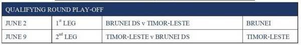 สำหรับรอบคัดเลือก เพลย์ออฟ บรูไน ดารุสซาลาม และ ติมอร์-เลสเต จะพบกันแบบเหย้า-เยือน เพื่อแย่งชิงตั๋วเข้าสู่รอบแบ่งกลุ่ม โดยเลกแรก บรูไน ดารุสซาลาม จะเป็นเจ้าภาพในวันที่ 2 มิถุนายน ก่อนที่เลกสอง ติมอร์-เลสเต จะเปิดบ้านรับการมาเยือนในวันที่ 9 มิถุนายน