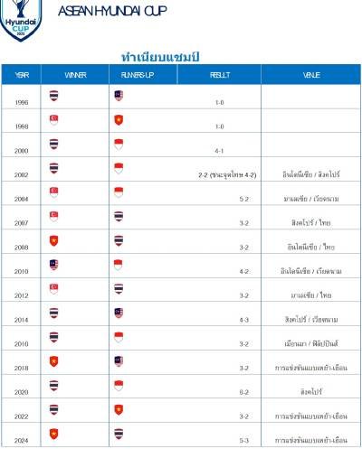 ทีมชาติไทย คือมหาอำนาจลูกหนังแห่งเอเชียตะวันออกเฉียงใต้ ตลอด 3 ทศวรรษที่ผ่านมา “ช้างศึก” ครองบัลลังก์อาเซียนด้วยการคว้าแชมป์ 7 สมัย เริ่มจากแชมป์แรกในปี 1996 และตามด้วยในปี 2000, 2002, 2014, 2016, 2020 และ 2022 ในปี 2024 ไทยเข้าชิงชนะเลิศเป็นครั้งที่ 11 ซึ่งถือเป็นสถิติสูงสุดของรายการ แต่ต้องผิดหวังหลังพ่าย เวียดนาม ด้วยสกอร์รวม 5-3 พลาดโอกาสสร้างประวัติศาสตร์คว้าแชมป์สมัยที่ 8 อย่างน่าเสียดาย