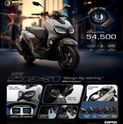New GPX DX1 (ดีเอ็กซ์วัน) รถ AT Scooter ในคลาส 125 ที่เรียกได้ว่าเป็น All New Model ใหม่ล่าสุด จากค่าย GPX มาใน Concept “Design My Identity #อิสระทางของเรา” ที่ออกแบบมาเพื่อตอบโจทย์การใช้งานจริงในชีวิตประจำวัน โดยเน้นให้เป็นรุ่นที่ขับขี่ง่าย ให้ความกะทัดรัด คล่องตัว เหมาะสมต่อสภาพการจราจรติดขัดในเขตเมือง หรือใช้ขับขี่แบบ Daily Use รวมไปถึงดีไซน์ที่สามารถสะท้อนตัวตนของผู้ขับขี่ได้อย่างชัดเจน เหมาะกับผู้ที่มองหารถออโตเมติกสำหรับการเดินทางในทุกวัน พร้อมสไตล์ที่แตกต่างไม่ซ้ำใคร!