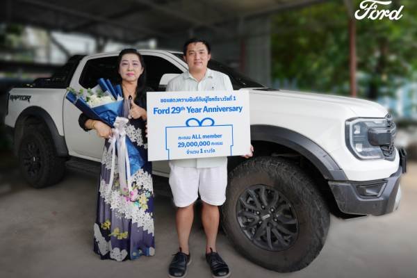 ฟอร์ด ประเทศไทย มอบรางวัลแก่ผู้โชคดีที่ได้รับรางวัลที่ 1 จากแคมเปญฉลองครบรอบ 29 ปี รับคะแนน All Member 29 ล้านคะแนน ได้แก่ คุณสุขใจ สุดดี ลูกค้าที่ซื้อรถฟอร์ด เรนเจอร์ แร็พเตอร์ เครื่องยนต์ 2.0 ลิตร
