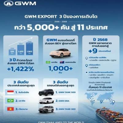 GWM (Thailand) ยกระดับสู่การเป็นแบรนด์รถยนต์ที่มีผลิตภัณฑ์ครอบคลุมทุกประเภทพลังงานที่ตอบสนองความต้องการของผู้ใช้งานทั่วทุกมุมโลก ด้วยแนวคิด “ครอบคลุมทุกการใช้งาน (All Scenarios) ด้วยผลิตภัณฑ์ที่ครอบคลุมทุกพลังงาน (All Powertrains) สู่การตอบสนองทุกกลุ่มผู้ใช้งานอย่างแท้จริง (All Users)” GWM (Thailand) สร้างสถิติการส่งออกที่เติบโตต่อเนื่องทั่วโลกในช่วง 3 ปีที่ผ่านมา (2566–2568) จากไม่กี่ร้อยคันในปีแรก สู่คาดการณ์เกิน 3,000 คัน ในปี 2025 ดันยอดสะสมทั้งปีทะลุ 5,000 คัน โดยมีแรงหนุนจากความต้องการที่เพิ่มขึ้นอย่างรวดเร็วในอาเซียน ลาตินอเมริกาและคาริบเบียน ออสเตรเลีย และแอฟริกา นำโดยรถยนต์ 2 กลุ่มพลังงานทั้ง BEV และ HEV จาก GWM ORA และ GWM TANK ร่วมผลักดันการเติบโตนี้เพื่อตอบสนองความต้องการของผู้ใช้งานที่มีต่อรถยนต์คุณภาพของ GWM นอกจากนี้ ยอดการส่งออกของ GWM (Thailand) ในกลุ่มประเทศอาเซียน ยังคงรักษาอัตราการเติบโตอย่างต่อเนื่อง โดยมีประเทศอินโดนีเซีย เวียดนาม และมาเลเซีย เป็น 3 ตลาดสำคัญในภูมิภาค ทั้งหมดนี้ สะท้อนศักยภาพของการเป็นศูนย์กลางการผลิตเพื่อส่งออกของโรงงานอัจฉริยะ GWM Smart Factory จังหวัดระยอง ที่มีกำลังการผลิตสูงสุดถึง 80,000 คันต่อปี
