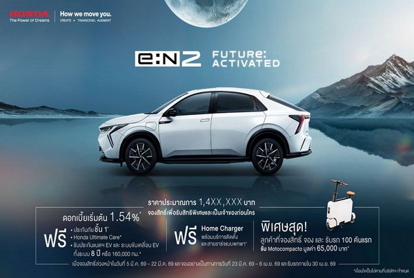 พิเศษ! เฉพาะลูกค้าที่รับรถ Honda e:N2 100 คันแรก รับเพิ่ม! สกู๊ตเตอร์ไฟฟ้า Motocompacto มูลค่า 65,000 บาท* (ไม่รวมภาษีมูลค่าเพิ่ม 7%) โดยลูกค้าจะต้องทำการจองสิทธิ์ล่วงหน้าระหว่างวันที่ 5 มีนาคม 2569 – 22 มีนาคม 2569 พร้อมทำการจองอย่างเป็นทางการระหว่างวันที่ 23 มีนาคม 2569 – 6 เมษายน 2569 และรับรถภายในวันที่ 30 เมษายน 2569 (โดยขอสงวนสิทธิ์การจองสิทธิ์ จองอย่างเป็นทางการและรับรถกับผู้จำหน่ายเดียวกัน)