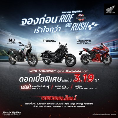 รถจักรยานยนต์ฮอนด้า มอบข้อเสนอสุดพิเศษสำหรับลูกค้าที่จองรถจักรยานยนต์ฮอนด้าในงาน Motor Show 2026 ด้วยโปรโมชันที่ตอบโจทย์ครบทุกสไตล์การขับขี่ ทั้งคอมมูเตอร์ ฮอนด้าบิ๊กไบค์ และ CUB House by Honda พร้อมข้อเสนอพิเศษเฉพาะช่วงงาน ทั้ง ดอกเบี้ยพิเศษต่ำสุดเพียง 0.99% (เฉพาะรุ่น) ของแถมสุดเอกซ์คลูซีฟ ประกันภัยชั้น 1 ทะเบียน และ พ.ร.บ. รวมถึงสิทธิพิเศษอื่น ๆ อีกมากมาย เพื่อให้การออกรถคันใหม่คุ้มค่าและเร้าใจกว่าที่เคย พบกับข้อเสนอที่ดีที่สุดแห่งปีได้ตั้งแต่วันนี้ – 5 เมษายน 2569 เท่านั้น!