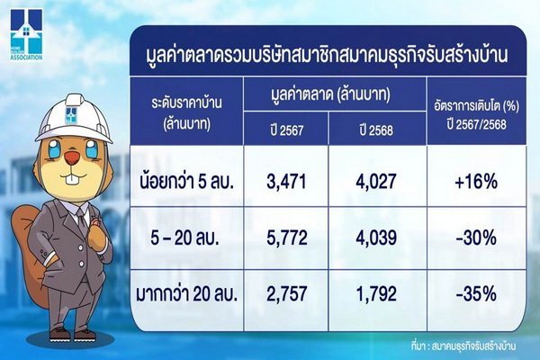 เจาะลึกยอดสั่งสร้างบ้าน สมาชิกสมาคมธุรกิจรับสร้างบ้านทั่วประเทศปี 2568 และคาดการณ์ปี 2569 ตลาดธุรกิจรับสร้างบ้าน Real Demand ยังแข็งแกร่ง บ้านต่ำกว่า 5 ล้านบาท เติบโต 16% สวนทางตลาดบ้านหรูหดตัว 35% แจงผลงานจัดตั้ง ‘คณะอนุกรรมการชั่วคราวภาคอีสานและภาคใต้’ สำเร็จแล้ว เร่งเดินหน้าจัดงานมหกรรมรับสร้างบ้าน กระตุ้นกำลังซื้อท้องถิ่นภายในปีนี้ มั่นใจตอกย้ำความเชื่อมั่นผู้บริโภค สร้างบ้านดีไม่ทิ้งงาน เตรียมชง ‘ครม.ชุดใหม่’ ดันมาตรการลดหย่อนภาษีสร้างบ้าน สินเชื่อดอกเบี้ยต่ำ ฟื้นกำลังซื้ออย่างเป็นรูปธรรม เผยสร้างบ้านวันนี้คุ้มสุด ‘โอกาสทองของผู้บริโภค’ สร้างบ้านราคาเดิม ก่อนต้นทุนขยับรับเศรษฐกิจฟื้นตัว