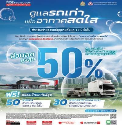 อีซูซุร่วมกับ กรมควบคุมมลพิษ กระทรวงทรัพยากรธรรมชาติและสิ่งแวดล้อมเชิญชวนลูกค้านำรถอีซูซุทุกประเภทที่มีอายุการใช้มากกว่า 15 ปี เข้ารับบริการตรวจเช็กสภาพรถฟรีที่ศูนย์บริการมาตรฐานอีซูซุทั่วประเทศ ภายใต้แคมเพจ์น “ดูแลรถเก่า..เพื่ออากาศสดใส” เพื่อบรรเทาปัญหามลพิษทางอากาศจากยานพาหนะที่ใช้งานมายาวนานและขาดการบำรุงรักษาอย่างเหมาะสม ระหว่างวันที่ 1 ธันวาคม 2568 ถึง 28 กุมภาพันธ์ 2569