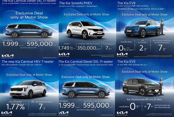 นอกจากนี้ เกีย เซลส์ (ประเทศไทย) ยังมาพร้อมกับข้อเสนอที่น่าสนใจอีกมากมาย เช่น The Kia Carnival HEV 7-Seater ที่เพิ่งเปิดตัวและได้รับรางวัล Best Hybrid MPV under 1,600 cc จาก Car Of The Year Award 2026 รวมถึง The Kia EV5, The Kia EV9 และ The Kia Sorento PHEV ทางบริษัทฯพร้อมมอบข้อเสนอสําหรับลูกค้าที่สนใจ อาทิเช่น ข้อเสนอราคาพิเศษ อัตราดอกเบี้ยพิเศษ และแพ็กเกจความคุ้มครองพิเศษ อาทิ การรับประกันคุณภาพ ประกันภัยชั้น 1 พร้อม พ.ร.บ. บริการช่วยเหลือฉุกเฉิน 24 ชั่วโมง การรับประกันแบตเตอรี่รถยนต์ (High-Voltage Battery) สำหรับรถกลุ่มอีวี (EV) ไฮบริด (HEV) และปลั๊กอินไฮบริด (PHEV) เป็นต้น