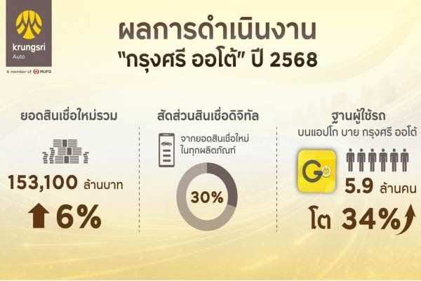 “ในปี 2568 กรุงศรี ออโต้ ยังคงครองความเป็นผู้นำตลาดสินเชื่อยานยนต์ ด้วยยอดสินเชื่อใหม่รวม 153,100 ล้านบาท เติบโต 6% จากปีก่อนหน้า โดยตัวเลขดังกล่าวได้รับแรงหนุนจากการเร่งทรานส์ฟอร์มสู่ดิจิทัลอย่างจริงจัง ผ่านนวัตกรรมสินเชื่อยานยนต์ดิจิทัลบนแอป โก บาย กรุงศรี ออโต้ รวมถึงการเชื่อมโยงบริการดิจิทัลกับพันธมิตรในอีโคซิสเต็ม ซึ่งส่งผลให้สัดส่วนสินเชื่อใหม่ผ่านช่องทางดิจิทัลพุ่งแตะ 30% ของยอดสินเชื่อใหม่ทั้งหมดในปีที่ผ่านมา”