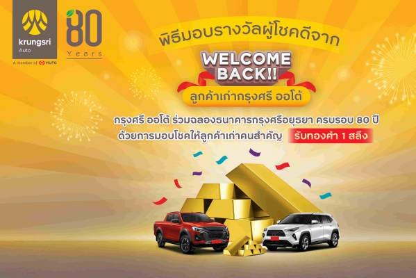 แคมเปญ ‘Welcome Back กรุงศรี นิว คาร์ มอบทอง รวมมูลค่า 1 ล้านบาท’ จะเดินหน้าอย่างต่อเนื่องตลอดปี 2568 โดยยังเหลือการจับรางวัลอีก 2 ครั้ง ลูกค้าเก่ากรุงศรี ออโต้ ที่สนใจ เพียงสมัครสินเชื่อรถใหม่ กรุงศรี นิว คาร์ และได้รับอนุมัติเป็นเลขที่สัญญา และรับรถ ตั้งแต่วันนี้ – 30 ธันวาคม 2568 หรือดูรายละเอียดเพิ่มเติมที่ https://shorturl.asia/7osXu
