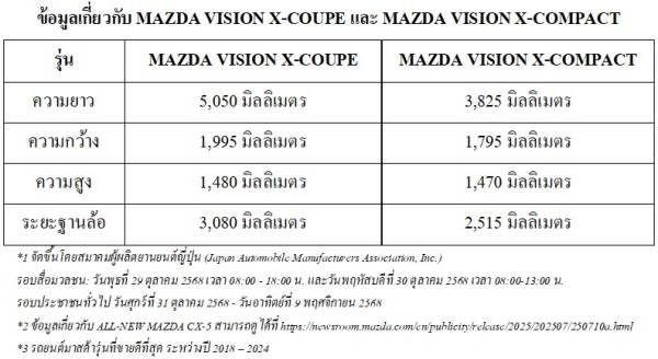 ฮิโรชิม่า, ญี่ปุ่น : มาสด้า มอเตอร์ คอร์ปอเรชั่น เผยโฉมยนตรกรรมยานยนต์ต้นแบบ Vision Model 2 รุ่น ได้แก่ MAZDA VISION X-COUPE (มาสด้า วิชั่น ครอส-คูเป้) และ MAZDA VISION X-COMPACT (มาสด้า วิชั่น ครอส-คอมแพ็ก) ในการแถลงข่าวรอบสื่อมวลชนในงาน Japan Mobility Show 2025*1 ซึ่งยานยนต์ต้นแบบทั้งสองรุ่นได้รับการถ่ายทอดแนวคิด  “The Joy of Driving Fuels a Sustainable Tomorrow” เพื่อมุ่งสู่อนาคตปี 2035 และสอดคล้องกับธีมของการจัดแสดงรถยนต์มาสด้าในปีนี้
