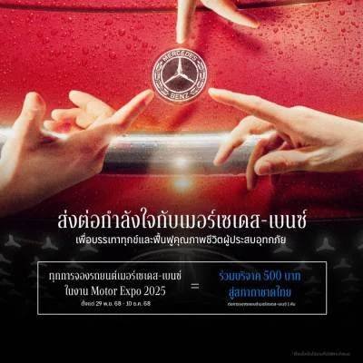 เมอร์เซเดส-เบนซ์ ประเทศไทย ส่งต่อกำลังใจให้ชาวไทยทุกคนในช่วงเวลาแห่งการบรรเทาทุกข์และฟื้นฟูคุณภาพชีวิตสำหรับผู้ที่ประสบอุทกภัยในทุกพื้นที่ ประกาศร่วมบริจาคให้กับสภากาชาดไทยจำนวน 500 บาท ต่อ 1 ใบจองในงาน Motor Expo 2025 ตั้งแต่ 29 พฤศจิกายน – 10 ธันวาคม 2568 ซึ่งยอดเงินบริจาคทั้งหมดจะถูกคำนวนตามยอดจองที่เกิดขึ้นจริงในงาน โดยทีมผู้บริหารเมอร์เซเดส-เบนซ์ ประเทศไทย จะร่วมส่งมอบเงินบริจาคทั้งหมด ในวันที่ 17 ธันวาคม 2568