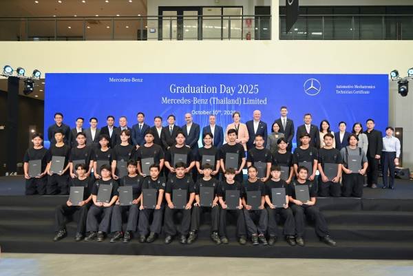 บริษัท เมอร์เซเดส-เบนซ์ (ประเทศไทย) จำกัด จัดงานวันสำเร็จการศึกษาและมอบประกาศนียบัตรให้แก่นักศึกษาช่างฝึกหัดจำนวน 25 คน ที่สำเร็จการศึกษาโครงการฝึกงานนักเรียนช่างฝึกหัดแบบทวิภาคี ในสาขาวิชาช่างเทคนิคยานยนต์เมคคาทรอนิกส์ของเมอร์เซเดส-เบนซ์ รุ่นที่ 34 และ 35 โดยโครงการฝึกงานระยะเวลา 2 ปีนี้ได้รับการรับรองจากหอการค้าและอุตสาหกรรมเยอรมัน (DIHK) ตามมาตรฐานการศึกษาทวิภาคีเยอรมัน-ไทย (GTDEE) ในสาขาเมคคาทรอนิกส์ยานยนต์ ภายในงาน ได้รับเกียรติจาก มร. มาร์ทิน ชเวงค์ ประธานเจ้าหน้าที่บริหารและกรรมการผู้จัดการใหญ่ และนายพุทธิ ตุลยธัญ รองประธานเจ้าหน้าที่บริหารและกรรมการฝ่ายบริการลูกค้า