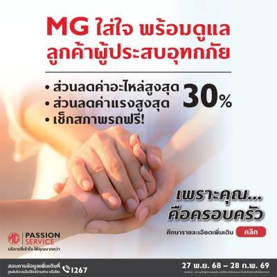 บริษัท เอสเอไอซี มอเตอร์ – ซีพี จำกัด และ บริษัท เอ็มจี เซลส์ (ประเทศไทย) จำกัด ผู้ผลิตและผู้จำหน่ายรถยนต์เอ็มจีในประเทศไทย ประกาศแคมเปญช่วยเหลือลูกค้าที่ได้รับผลกระทบจากสถานการณ์อุทกภัยในหลายพื้นที่ของประเทศ ด้วยการแบ่งเบาภาระค่าใช้จ่ายในการซ่อมบำรุงรถยนต์ เอ็มจี ที่ได้รับความเสียหายจากเหตุน้ำท่วม ด้วยบริการตรวจเช็กสภาพรถยนต์ 46 รายการ มอบส่วนลดค่าแรง และค่าอะไหล่สูงสุด 30%* ระหว่าง 27 พฤศจิกายน 2568 ถึง 28 กุมภาพันธ์ 2569