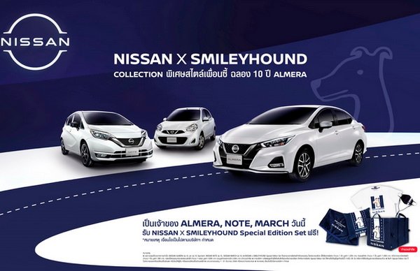 นิสสัน ประเทศไทย ฉลองครบรอบ 10 ปี นิสสัน อัลเมร่า ในประเทศไทย โดยการร่วมมือกับสไมลี่ฮาวด์ (SMILEYHOUND) แบรนด์เสื้อผ้าสตรีทแวร์ที่สดใสและเปี่ยมไปด้วยพลัง เพื่อขอบคุณสำหรับลูกค้าที่ซื้ออัลเมร่า โน๊ต และมาร์ช ตั้งแต่ 1 ธันวาคม 2564 ถึง 31 ธันวาคม 2564 โดยสินค้ามีจำนวนจำกัด*