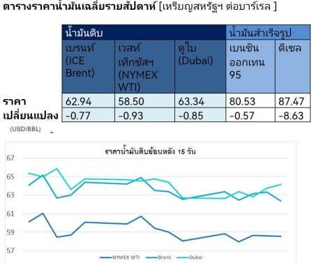 ปตท. เผยผลการวิเคราะห์สถานการณ์ตลาดน้ำมัน สัปดาห์วันที่ 1-5 ธ.ค. 68 และแนวโน้มสัปดาห์วันที่ 8-12 ธ.ค. 68 โดยตลาดน้ำมันสำเร็จรูปเบรนท์ (ICE Brent) ราคา 62.94 เหรียญสหรัฐฯ ต่อ บาร์เรล ปรับราคาลดลง ––0.77 เหรียญสหรัฐฯ ตลาดน้ำมันสำเร็จรูปของ เวสท์เท็กซัสฯ (NYMEX WTI) ราคา 58.50 เหรียญสหรัฐฯ ต่อ บาร์เรล ปรับราคาลดลง -0.85 เหรียญสหรัฐฯ ตลาดน้ำมันสำเร็จรูปดูไบ (Dubai) ราคา 63.34 เหรียญสหรัฐฯ ต่อ บาร์เรล ปรับราคาลดลง -0.71เหรียญ สหรัฐฯ ขณะที่ราคาน้ำมันสำเร็จรูปซื้อซื้อขายล่วงหน้าที่สิงคโปร์ ราคาเบนซินออกเทน 95 ปรับราคาลดลง -0.57 เหรียญ สหรัฐฯ มาเป็นราคา 80.53 เหรียญ สหรัฐฯ ราคาน้ำมันดีเซลราคาปรับขึ้น -8.63 เหรียญ สหรัฐฯ มาเป็นราคา 87.47 เหรียญสหรัฐฯ