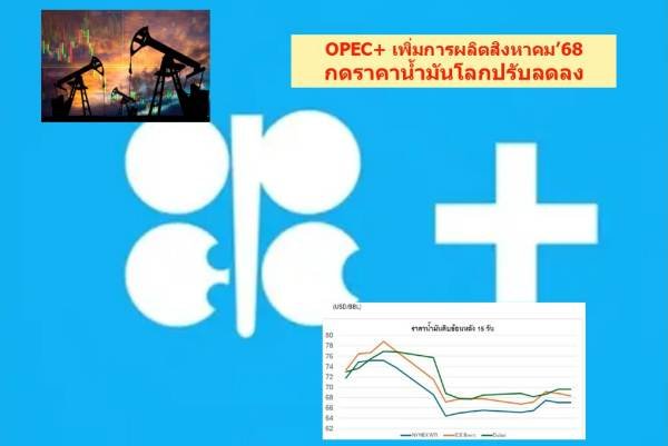 – 5 ก.ค. 68 สมาชิก 8 ประเทศของกลุ่ม OPEC+ มีมติเพิ่มการผลิตน้ำมันดิบปริมาณเดือนละ 548,000 บาร์เรลต่อวัน ในเดือน ส.ค. 68 โดยเพิ่มการผลิตสะสมในเดือน เม.ย. – ส.ค. 68 ปริมาณรวม 1.92 ล้านบาร์เรลต่อวัน ตลาดคาดว่าจะชดเชยที่เคยอาสาลดการผลิตโดยสมัครใจ (Voluntary Cut) 2.2 ล้านบาร์เรลต่อวัน ได้ทั้งหมดในเดือน ก.ย. 68 เร็วกว่ากำหนดเดิมประมาณ 1 ปี