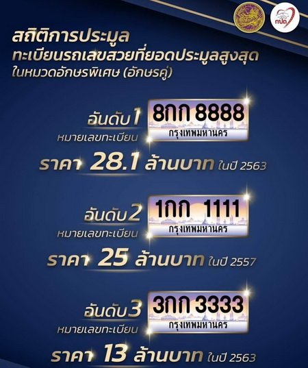 ข้อมูลสถิติการประมูลทะเบียนรถเลขสวยของกรมการขนส่งทางบก หมายเลขทะเบียนที่ได้รับความนิยมยังคงเป็นหมายเลขทะเบียนรถในหมวดอักษรพิเศษ (อักษรคู่) เช่น “กก” ซึ่งมูลค่าการประมูลสูงสุด อันดับที่ 1 เป็นหมายเลขทะเบียน “8กก 8888” ราคา 28.1 ล้านบาท ในปี 2563 อันดับที่ 2 หมายเลขทะเบียน “1กก 1111” ราคา 25 ล้านบาท ในปี 2557 และอันดับที่ 3 หมายเลขทะเบียน 3กก3333 ราคา 13 ล้านบาท ในปี 2559