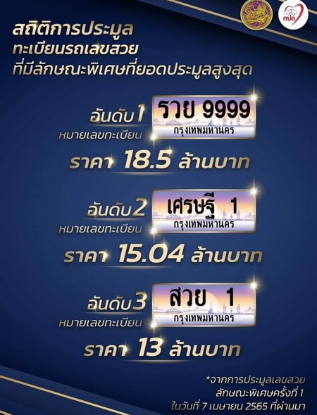 ส่วนทะเบียนรถเลขสวยที่มีลักษณะพิเศษ อันดับที่ 1 เป็นหมายเลขทะเบียน “รวย 9999” ราคา 18.5 ล้านบาท อันดับที่ 2 เป็นหมายเลขทะเบียน“เศรษฐี 1 ” ราคา 15.04 ล้านบาท และอันดับที่ 3 เป็นหมายเลขทะเบียน “สวย 1 ” ราคา 13 ล้านบาท จากการประมูลเลขสวยลักษณะพิเศษครั้งที่ 1 ในวันที่ 7 เมษายน 2565 ที่ผ่านมา