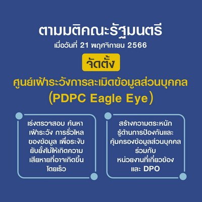 ศูนย์เฝ้าระวังการละเมิดข้อมูลส่วนบุคคล “PDPC Eagle Eye” เปิดเผย ปัจจุบันปัญหาการละเมิดข้อมูลส่วนบุคคคล และข้อมูลรั่วไหลของหน่วยงานในภาครัฐ และภาคเอกชน เป็นปัญหาที่ขยายตัวอย่างรวดเร็ว ทำให้ประชาชนและหน่วยงานต่างๆ ได้รับความเดือดร้อน อย่างที่เราเห็นจากข่าวตามสื่อต่างๆแทบทุกวัน ซึ่งสิ่งที่เห็นชัดเจนที่สุดก็คือ แฮกเกอร์ สแกมเมอร์ ก็พยายามพัฒนาเทคโนโลยีต่างๆมาหลอกหลวงผู้คน สำนักงานคณะกรรมการคุ้มครองข้อมูลส่วนบุคคล (สคส.) หรือ PDPC ตระหนักถึงปัญหาเหล่านี้ จึงเดินหน้าทำงานในเชิงรุก เปิดศูนย์เฝ้าระวังการละเมิดข้อมูลส่วนบุคคล “PDPC Eagle Eye” หน่วยงานภายใต้สำนักตรวจสอบและกำกับดูแล สำนักงานคณะกรรมการคุ้มครองข้อมูลส่วนบุคคล (สคส.) หรือ PDPC เพื่อติดตาม เฝ้าระวัง การละเมิดข้อมูลส่วนบุคคล โดย “PDPC Eagle Eye” มีหน้าที่ความรับผิดชอบดังนี้
