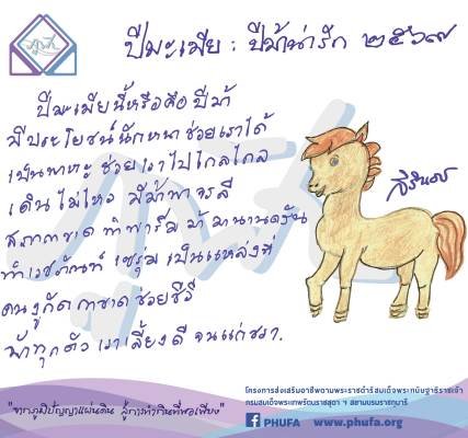 ภาพวาดฝีพระหัตถ์ “ปีม้าน่ารัก” ที่ได้รับพระราชทานพระราชานุญาต ให้นำมาจัดทำสินค้าร้านภูฟ้าหลากหลายผลิตภัณฑ์ เป็นภาพม้าที่กำลังทำท่าเหยาะย่างอย่างสง่างาม หน้าตาแจ่มใส สื่อถึงความเป็นมิตรและพร้อมส่งความสุขให้กับชาวไทยทุกคน