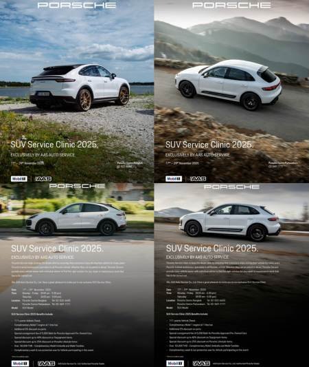 แคมเปญพิเศษ “Porsche SUV Service Clinic 2025” จัดขึ้นระหว่าง 17 – 29 พฤศจิกายน 2568 ณ Porsche Centre Bangkok และ Porsche Centre Pattanakarn โดยมุ่งเน้นการดูแลรถยนต์ปอร์เช่ในกลุ่ม SUV อย่างละเอียดครบถ้วน ภายใต้แนวคิด ‘AAS Looking After YOU and Your Car’ เพื่อมอบความอุ่นใจและความมั่นใจให้แก่สมาชิกครอบครัวเอเอเอสฯ ทุกท่านในทุกการเดินทาง