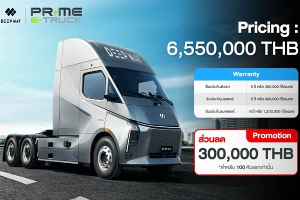“ส่วนกลยุทธ์การตลาดจะเน้นที่ Fleet ขนาดกลาง–ใหญ่, อุตสาหกรรมอาหาร, อีคอมเมิร์ซ และ Supply Chain ที่ต้องการลดต้นทุนพลังงานและ Carbon Footprint และบริการหลังการขายครบวงจร ทั้งการติดตั้งสถานีชาร์จในพื้นที่ (Depot Charging) การซ่อมบำรุง และการฝึกอบรมพนักงานขับรถพร้อมเปิดรับจอง DeepWay Star 6×4 แล้ววันนี้ พร้อมข้อเสนอพิเศษสำหรับลูกค้ากลุ่มองค์กร ประกาศราคาจำหน่าย 6,550,000 บาท และมีส่วนลดพิเศษคันละ 300,000 บาท สำหรับลูกค้า 100 รายแรก”