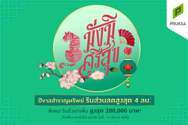‘พฤกษา’ จัดโปรโมชั่นเสริมเฮง มอบความสุข รับปีขาล ในแคมเปญ “มั่งมีศรีสุข” มอบอั่งเปาฉลองตรุษจีน พร้อมของแถม และส่วนลดรวมมูลค่าสูงสุดถึง 4 ล้านบาท และพิเศษกว่า! ปรึกษาฮวงจุ้ยบ้าน และรับป้ายรวยเสริมมงคลโดยอาจารย์เป็นหนึ่ง ซินแสฮวงจุ้ยชื่อดัง ระหว่างวันที่ 1 ก.พ. – 31 มี.ค. 2565 นี้