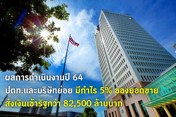 ปตท.และบริษัทย่อย เปิดแถลงผลการดำเนินงานในปี 2564 โดยมีกำไร 5% ของยอดขาย พร้อมกันนี้ บอร์ดของ ปตท. ยังได้อนุมัติเงินปันผลประจำปี รวมเงินส่งรัฐปี 2564 กว่า 82,500 ล้านบาท ประกาศเดินหน้าสร้างผลตอบแทนสู่ประเทศทุกมิติต่อเนื่อง
