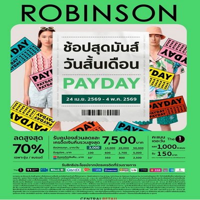 มา “ช้อปสุดมันส์ วันสิ้นเดือน” กับมหกรรมความคุ้มในแคมเปญ “Robinson Payday” ตั้งแต่ 24 เมษายน – 4 พฤษภาคม 2569 ที่ห้างสรรพสินค้าโรบินสันทุกสาขา (ยกเว้นสาขาจังซีลอน) และทุกช่องทางการช้อปปิ้งสุดสะดวกของห้างฯ ไม่ว่าจะเป็น Robinson Chat & Shop, Robinson Personal Shopper on Demand ผู้ช่วยช้อปส่วนตัวที่พร้อมดูแลทุกความต้องการ, Central App และเว็บไซต์ www.central.co.th ตลอด 24 ชั่วโมง รวมถึง Facebook Page Robinson Department Store และพบความคุ้มค่าที่หลากหลายกับ “สัญลักษณ์คุ้มค่าที่โรบินสันการันตี” ทั้งสินค้าที่มีที่นี่ที่เดียว, สินค้าใหม่, ซื้อมากลดมาก, ลดแรง สูงสุด 70%, ซื้อ 1 แถม 1, หมดแล้วหมดเลย, สินค้าราคาเดียว ที่ห้างสรรพสินค้าโรบินสันทุกสาขา
