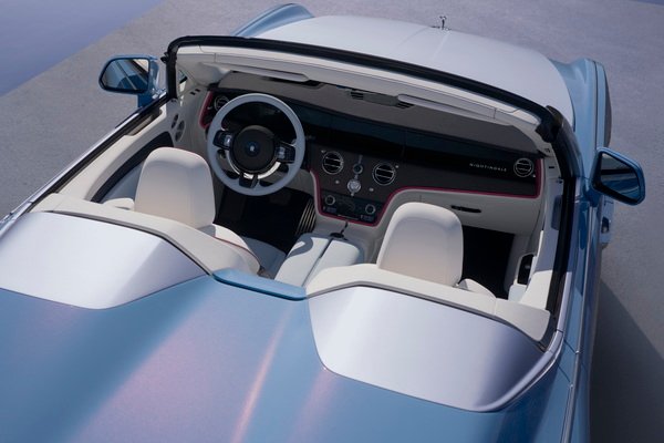 A single hull line runs continuously along Project Nightingale from front to rear, inspired by the line that separates a yacht’s hull from its superstructure. It begins at sculpted ‘Pinnacles’ on the front wings – a subtle reference to heritage Rolls-Royce designs – before flowing uninterrupted to the trailing edge. Set intentionally high, it creates the sensation of being enveloped deep inside the motor car. An upswept volume behind the headrests rises like a turned collar, cosseting driver and companion against the elements, integrating the height of the headrests into the sculpture of the motor car itself.