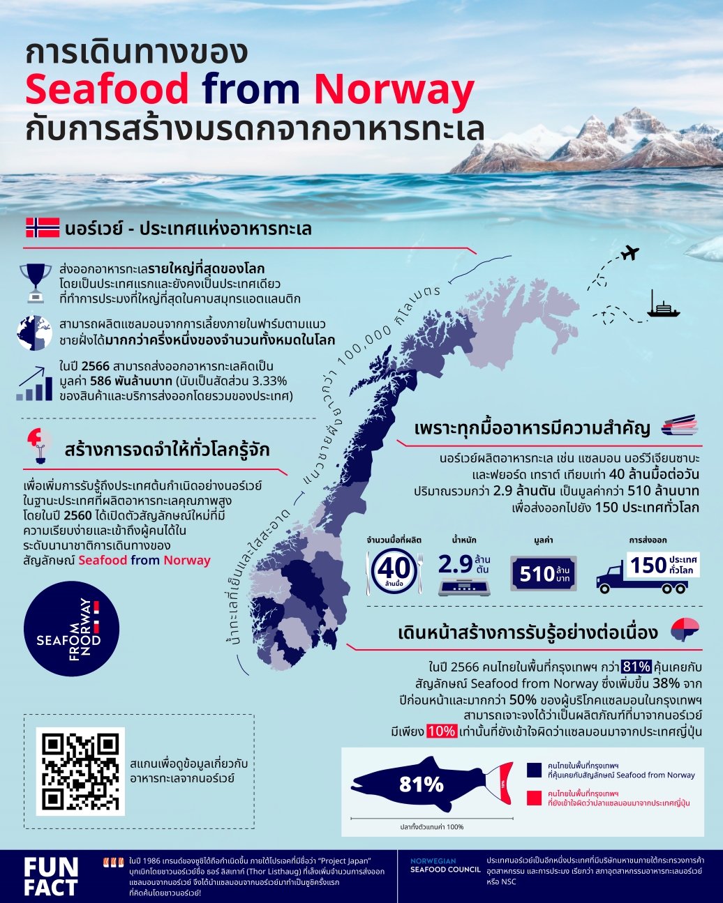 สัญลักษณ์ Seafood from Norway ทำให้แบรนด์อาหารทะเลจากนอร์เวย์มีความแข็งแกร่งมากขึ้นในตลาดโลก ปัจจุบันอุตสาหกรรมอาหารทะเลกำลังเติบโตเป็นอย่างมาก ในปี 2566 ประเทศไทยนำเข้าแซลมอนและฟยอร์ดเทราต์เป็นปริมาณกว่า 23,526 ตัน และแซลมอนและฟยอร์ดเทราต์สดรวมกว่า 21,808 ตัน ประเทศไทยกลายเป็นตลาดที่สำคัญของภูมิภาคเอเชียตะวันออกเฉียงใต้สำหรับผู้ส่งออกอาหารทะเลจากนอร์เวย์ ซึ่งมีมูลค่าตลาดอยู่ที่ 7.5 พันล้านบาท การเพาะเลี้ยงสัตว์น้ำมาอย่างยาวนานนับศตวรรษของประเทศแห่งอาหารทะเลอย่างนอร์เวย์ยังคงเติบโตต่อไป ด้วยการผลิตที่มีความยั่งยืน ความชำนาญด้านอาหารทะเล และธรรมชาติอันบริสุทธิ์ ทำให้นอร์เวย์สามารถผลิตโปรตีนคุณภาพสูงจากท้องทะเลที่เหมาะกับทุกจานอาหาร ในขณะเดียวกันแซลมอนจากนอร์เวย์ก็ได้เดินทางจากการเป็นวัตถุดิบสำหรับซูชิและซาชิมิ มาสู่อาหารไทยอันแสนอร่อยและครองใจคนไทยได้ไม่น้อย เรียกได้ว่าอาหารทะเลจากนอร์เวย์เป็นมื้ออาหารที่เหมาะสำหรับทุกคน
