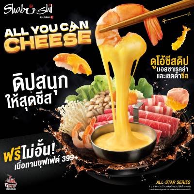 ชาบูชิ (Shabushi) สร้างปรากฏการณ์ความอร่อยสุดชีส มอบรสชาติความสุข…ไม่สิ้นสุด ภายใต้แคมเปญ All Star Series โดยครั้งนี้ขอจัดหนักเอาใจสายชีส All You Can Cheese ด้วย “ดูโอ้ชีสดิป” ชีสดิปสูตรพิเศษ ที่ผสานชีสมอสซาเรลลาเข้ากันอย่างลงตัวกับชีสเชดด้ารสชาติเข้มข้น…หอมมัน จะดิปกับเมนูอะไร ๆ ก็อร่อยโดนใจไปหมด พร้อมเสิร์ฟฟรีไม่อั้น เมื่อรับประทานบุฟเฟต์ 399 บาท+ ขึ้นไป