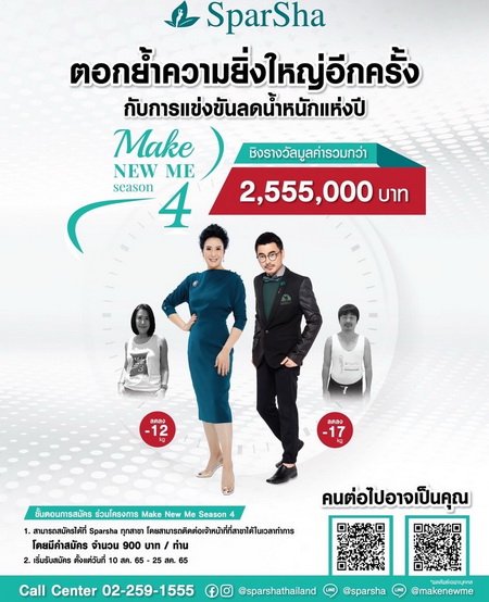 สปาชา กรุ๊ป ขอเชิญชวนหนุ่มและสาวที่สนใจอายุตั้งแต่ 20 ปีขึ้นไป แต่ไม่เกิน 70 ปี มาร่วมชาเลนจ์ตัวเองด้วยการแข่งขันลดน้ำหนัก โบกมือลาไขมัน ปั้นหุ่นแซ่บ หุ่นเฟิร์ม หุ่นสมาร์ต ในโครงการ “สปาชา เมค นิว มี ซีซั่น 4” (SparSha Make New Me Season 4) ชิงรางวัลมูลค่ากว่า 2,555,000 บาท