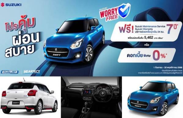 ซูซูกิ มอเตอร์ (ประเทศไทย) สุดปลื้มโปรโมชั่น Suzuki Worry Free Program สร้างปรากฎการณ์แห่งความคุ้มค่า 7 ปีลูกค้าเชื่อมั่น ดันยอดขาย Suzuki Swift โตต่อเนื่อง ประกาศเดินหน้าต่อยอดด้วยการอัดโปรฯ แรงครึ่งปีหลัง ดอกเบี้ยเริ่มต้น 0% หรือเลือกผ่อนนาน 99 เดือนตั้งแต่วันนี้-30 พฤศจิกายน 2568
