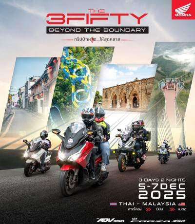 ไทยฮอนด้า เตรียมเปิดประสบการณ์การเดินทางครั้งใหม่ในกิจกรรม The 3Fifty Beyond The Boundary Chapter 2 เชิญชวนชาว FORZA และ ADV รุ่น 350 ซีซี เดินทางข้ามแดนบนเส้นทางพิเศษจากหาดใหญ่ สู่ปีนัง ประเทศมาเลเซีย ก่อนปิดท้ายที่เมืองเบตง จังหวัดยะลา พร้อมเพลิดเพลินกับประสบการณ์การขับขี่ท่ามกลางธรรมชาติ เส้นทางเลียบทะเล และวัฒนธรรมอันหลากหลาย อีกทั้งได้พักผ่อนในเมืองที่เต็มไปด้วยเสน่ห์น่าค้นหา ระหว่าง 5–7 ธันวาคม 2568 นี้