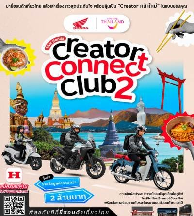 Thai Honda Creator Connect Club 2 : สุขทันทีที่ขี่ฮอนด้าเที่ยวไทย จัดขึ้นเพื่อสานต่อความสำเร็จจากปีแรก โดยปีนี้ได้ขยายแคมเปญให้พิเศษขึ้นด้วยการจับมือกับ ททท. พร้อมดึงแคมเปญ “สุขทันที…ที่เที่ยวไทย” มาเพื่อส่งเสริมการเดินทางท่องเที่ยวในประเทศ ให้เป็นเรื่องใกล้ตัว เข้าถึงง่าย และสามารถสร้างประสบการณ์ใหม่ ๆ ได้เพียงแค่ขี่รถจักรยานยนต์ฮอนด้า นอกจากนี้ ยังเป็นเวทีเปิดโอกาสให้เหล่า Local Creators ถ่ายทอดเสน่ห์ของแหล่งท่องเที่ยวไทยในมุมมองที่แตกต่าง เพื่อขยายฐานผู้สื่อสารด้านการท่องเที่ยวให้กว้างขวางยิ่งขึ้น