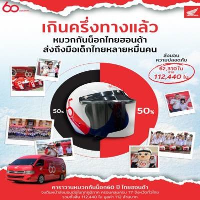 ไทยฮอนด้า ผู้ผลิตและจัดจำหน่ายรถจักรยานยนต์และเครื่องยนต์อเนกประสงค์ฮอนด้าในประเทศไทย  เดินหน้าส่งต่อความห่วงใยสู่สังคมไทยในวาระครบรอบ 60 ปี ภายใต้โครงการรณรงค์ความปลอดภัยทางถนนระดับประเทศ “60 ปี ไทยฮอนด้า ขับขี่ปลอดภัย เพื่อสังคมไทยที่ยั่งยืน” ล่าสุด คาราวานหมวกกันน็อกไทยฮอนด้า ได้เดินทางมาถึง “ครึ่งทาง” ของภารกิจแล้ว ด้วยการส่งมอบหมวกนิรภัยมาตรฐาน มอก. จำนวน 62,310 ใบ จากเป้าหมายใหญ่ 112,410 ใบ สู่เยาวชนและประชาชนใน 50 จังหวัดทั่วประเทศ