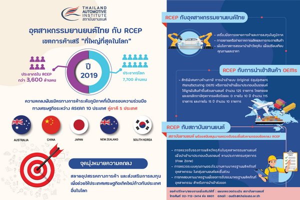 สำหรับ ประเทศ คู่ภาคี 5 ประเทศ ประกอบด้วย ออสเตรเลีย จีน ญี่ปุ่น นิวซีแลนด์ และ เกาหลีใต้ เพื่อช่วยเพิ่มโอกาส และเพิ่มศักยภาพในการแข่งขันให้แก่อุตสาหกรรมยานยนต์ไทย ซึ่งคาดว่าจะได้รับประโยชน์เพิ่มเติมเมื่อเปรียบเทียบกับ FTA ที่ไทยมีอยู่ ซึ่งจะสร้างโอกาสทางการตลาดและการจ้างงานให้กับธุรกิจ และผู้คนในภูมิภาค โดยประเทศไทยเริ่มบังคับใช้ความตกลงหุ้นส่วนทางเศรษฐกิจระดับภูมิภาค (RCEP) มีผลตั้งแต่ 1 มกราคม 2565 เป็นต้นไป โดยมีสินค้าชิ้นส่วนยานยนต์ ภายใต้ความตกลง RCEP ที่ระบุเงื่อนไข OEM ซึ่งต้องผ่านการรับรองกฎถิ่นกำเนิดสินค้าจากประเทศส่งออก จำนวน 125 รายการ