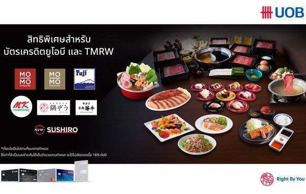 ธนาคารยูโอบี ประเทศไทย ผนึกกำลังกับ 7 ร้านอาหารสุดฮิต อาทิ Mo-Mo Paradise, Fuji, MK สุกี้, Nabezo Premium, Gyukatsu Kyoto Katsugyu และ Sushiro จัดแคมเปญพิเศษ ชวนเหล่านักชิม มาฟินทุกมื้อ อร่อยทุกวัน สำหรับลูกค้าบัตรเครดิตยูโอบี รับสิทธิพิเศษ ทั้งส่วนลด และเครดิตเงินคืนสูงสุดถึง 50% จัดเต็มสำหรับผู้ถือบัตรเครดิตยูโอบี เท่านั้น โดยลูกค้าธนาคารยูโอบีที่ถือบัตรเครดิตภายใต้แบรนด์ซิตี้สามารถเข้าร่วมโปรโมชันนี้ได้ และจำกัดจำนวนสิทธิ์รวมกัน
