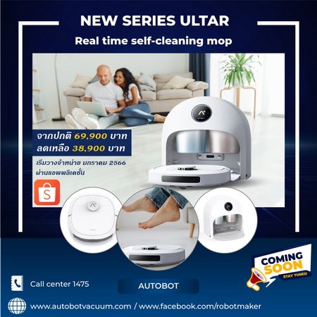 “AUTOBOT Ultra Real time self-cleaning mop วางจำหน่ายเดือนมกราคม 2566 ต้อนรับเทศกาลตรุษจีน เปิดตัวที่แรกใน App Shopee กับราคาสุดเอ็กซ์คลูซีฟ จากปกติ 69,900 บาท ราคาเปิดตัว 38,900 บาท เฉพาะใน Shopee ที่เดียวเท่านั้น พร้อมร่วมโปรโมชั่น Trade in ลดสูงสุด 11,900 บาท และเข้าร่วมโครงการ “ช้อปดีมีคืน 2566” ตอบรับมาตรการกระตุ้นเศรษฐกิจจากรัฐบาล ร่วมลดหย่อนภาษีสูงสุด 40,000 บาท”