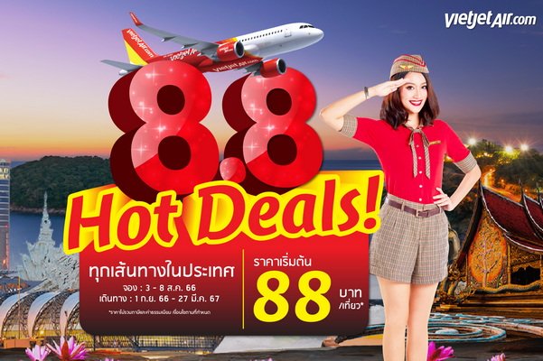 สายการบินไทยเวียตเจ็ทฉลองวันดับเบิลเดย์ประจำเดือนสิงหาคมด้วยโปรโมชั่น “8.8 Hot Deals” เสนอบัตรโดยสารราคาพิเศษ เริ่มต้นเพียง 88 บาท (ราคาไม่รวมภาษีและค่าธรรมเนียม) สำหรับเดินทางบนเครือข่ายเส้นทางบินภายในประเทศของไทยเวียตเจ็ท ผู้โดยสารสามารถสำรองบัตรโดยสารได้ระหว่าง 3 – 8 สิงหาคม 2566 เดินทางได้ระหว่าง 1 กันยายน 2566 – 27 มีนาคม 2567 (ยกเว้นวันหยุดนักขัตฤกษ์) ที่ www.vietjetair.com