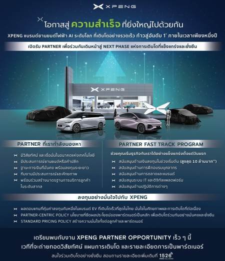 เตรียมพบกับงาน Xpeng Partner Opportunity เวทีที่จะถ่ายทอดวิสัยทัศน์ แผนการเติบโต และรายละเอียดการเป็นพาร์ทเนอร์ สอบถามรายละเอียดเพิ่มเติมได้แล้ววันนี้ โทร. 1526